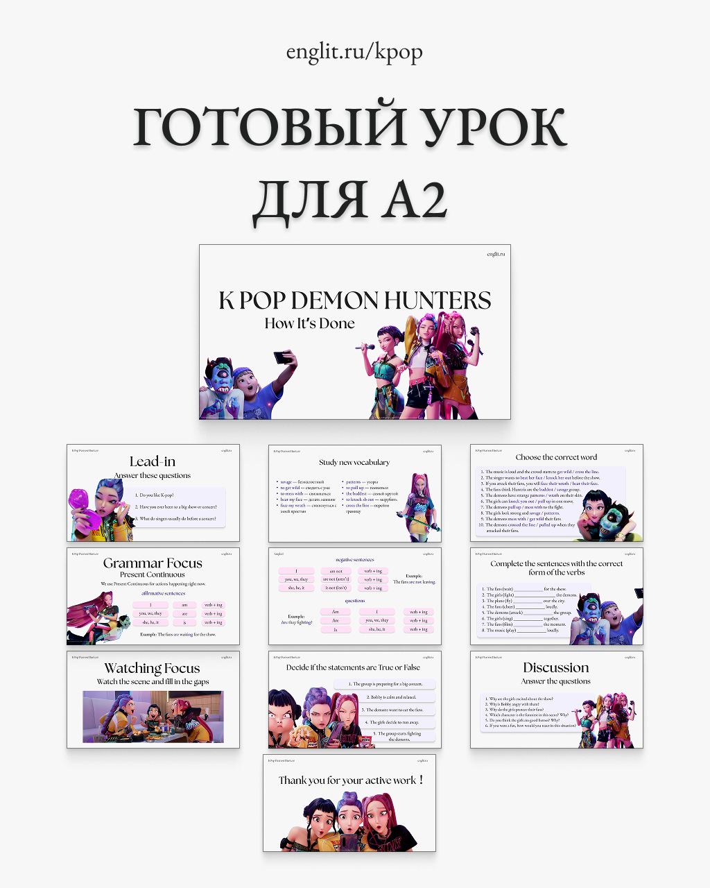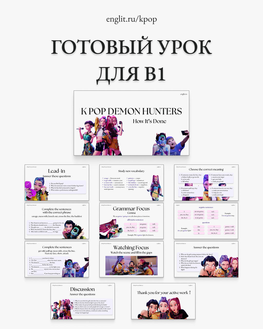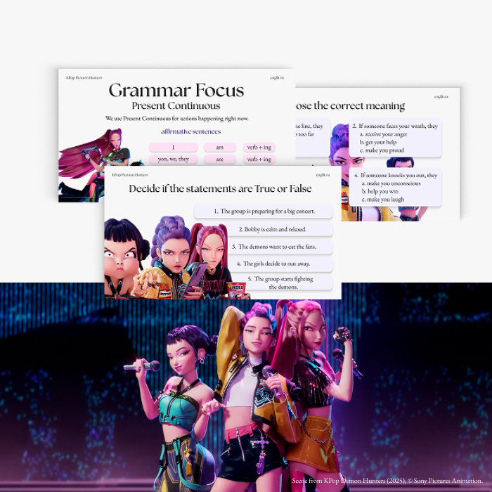 Готовый комплект из 4 увлекательных уроков по мультфильму Кей-поп охотницы на демонов / K-pop Demon Hunters. Каждый урок создан для работы с 20-минутным фрагментом мультфильма и включает продуманную пошаговую методику. Подходит для индивидуальных и мини-групповых занятий на уровнях B1 и выше.