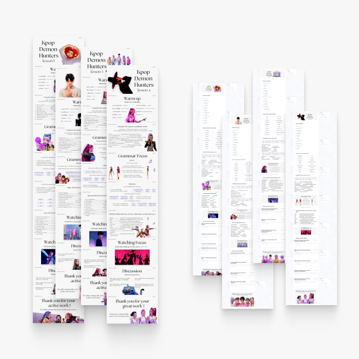 Готовый комплект из 4 увлекательных уроков по мультфильму Кей-поп охотницы на демонов / Kpop Demon Hunters Каждый урок создан для работы с 20-минутным фрагментом мультфильма и включает продуманную пошаговую методику. Подходит для индивидуальных и мини-групповых занятий на уровнях B1 и выше.