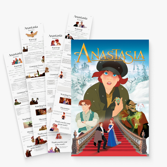 Готовый комплект из 4 увлекательных уроков по мультфильму Anastasia Каждый урок создан для работы с 15–20-минутным фрагментом мультфильма и включает продуманную пошаговую методику. Подходит для индивидуальных и мини-групповых занятий на уровнях B1+ и выше.