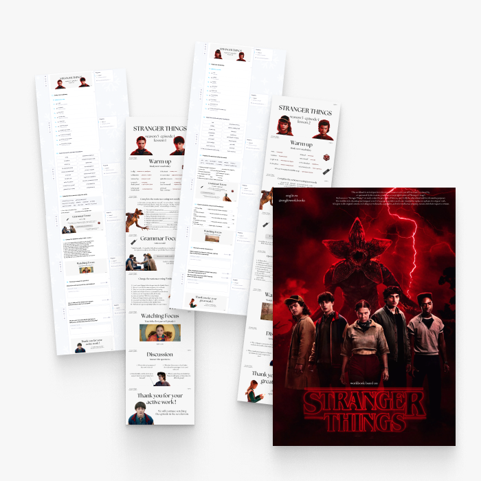Готовые комплекты из увлекательных уроков по сериалу Stranger Things season 5. 1 серия = 2 готовых урока. Каждый урок создан для работы с 30-минутным фрагментом серии и включает продуманную пошаговую методику. Подходит для индивидуальных и мини-групповых занятий на уровнях B1 и выше.