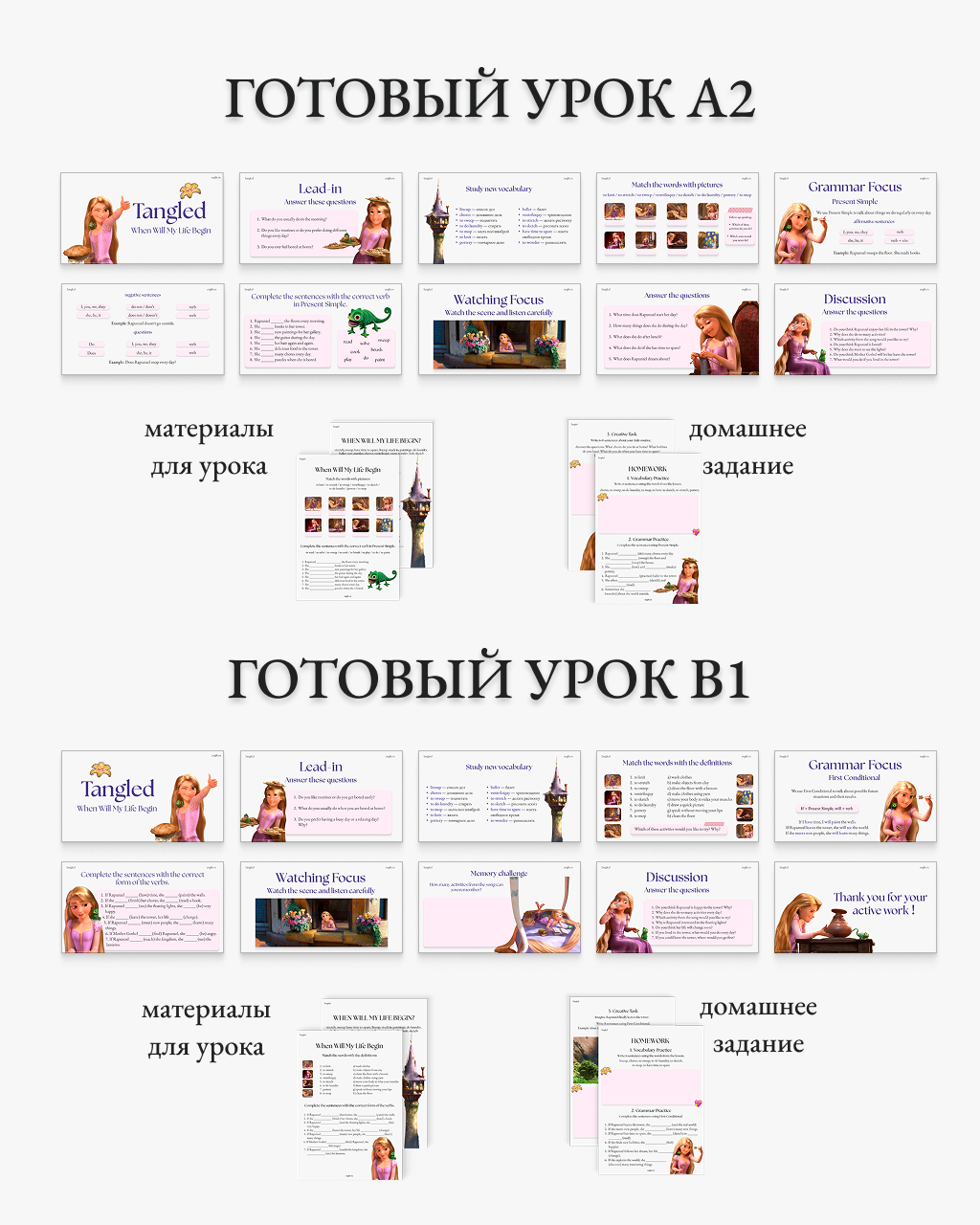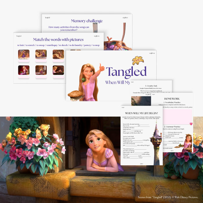 Готовый урок (60 минут) по сцене из мультфильма Рапунцель /Tangled (песня When will my life begin). Это лёгкая и динамичная сцена, в которой Рапунцель поёт о своей повседневной жизни в башне и мечтает о мире за её пределами. Уроки адаптированы для двух уровней (A2 и B1): задания отличаются по сложности, а грамматика подобрана под уровень студентов.