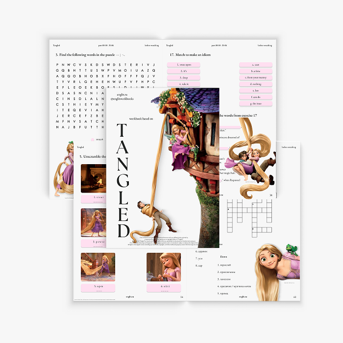 Рабочая тетрадь по мультфильму Рапунцель / Tangled. Погрузитесь в английский с помощью более чем 130 страниц практики, которые помогут прокачать все ключевые навыки — от лексики и грамматики до говорения и понимания сюжета.