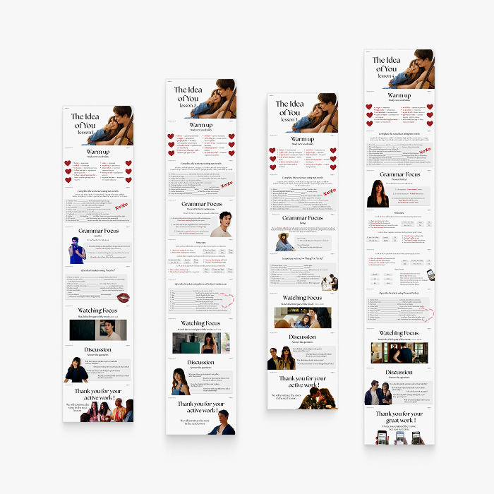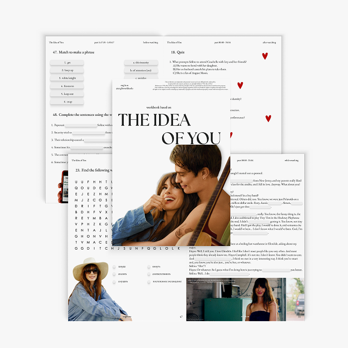 Готовый комплект из 4 увлекательных уроков по фильму Мысль о тебе / The Idea of You Каждый урок создан для работы с 20-минутным фрагментом фильма и включает продуманную пошаговую методику. Подходит для индивидуальных и мини-групповых занятий на уровнях B1 и выше.